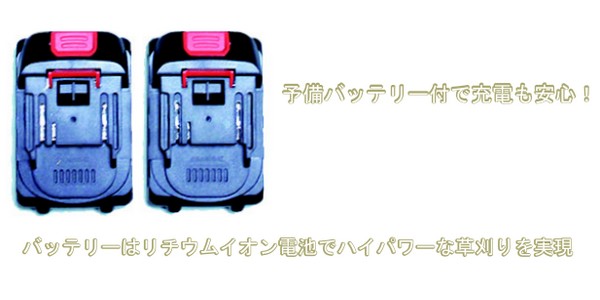 【スペック】●セット内容 草刈り機本体、ハンドル、フロントガード、リアガード、リアガード取付ネジ、 六角ソケットレンチ、バッテリー(充電器付)×2個